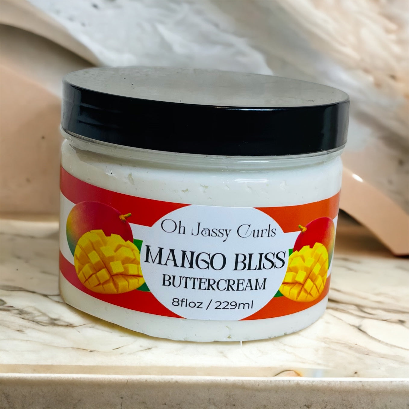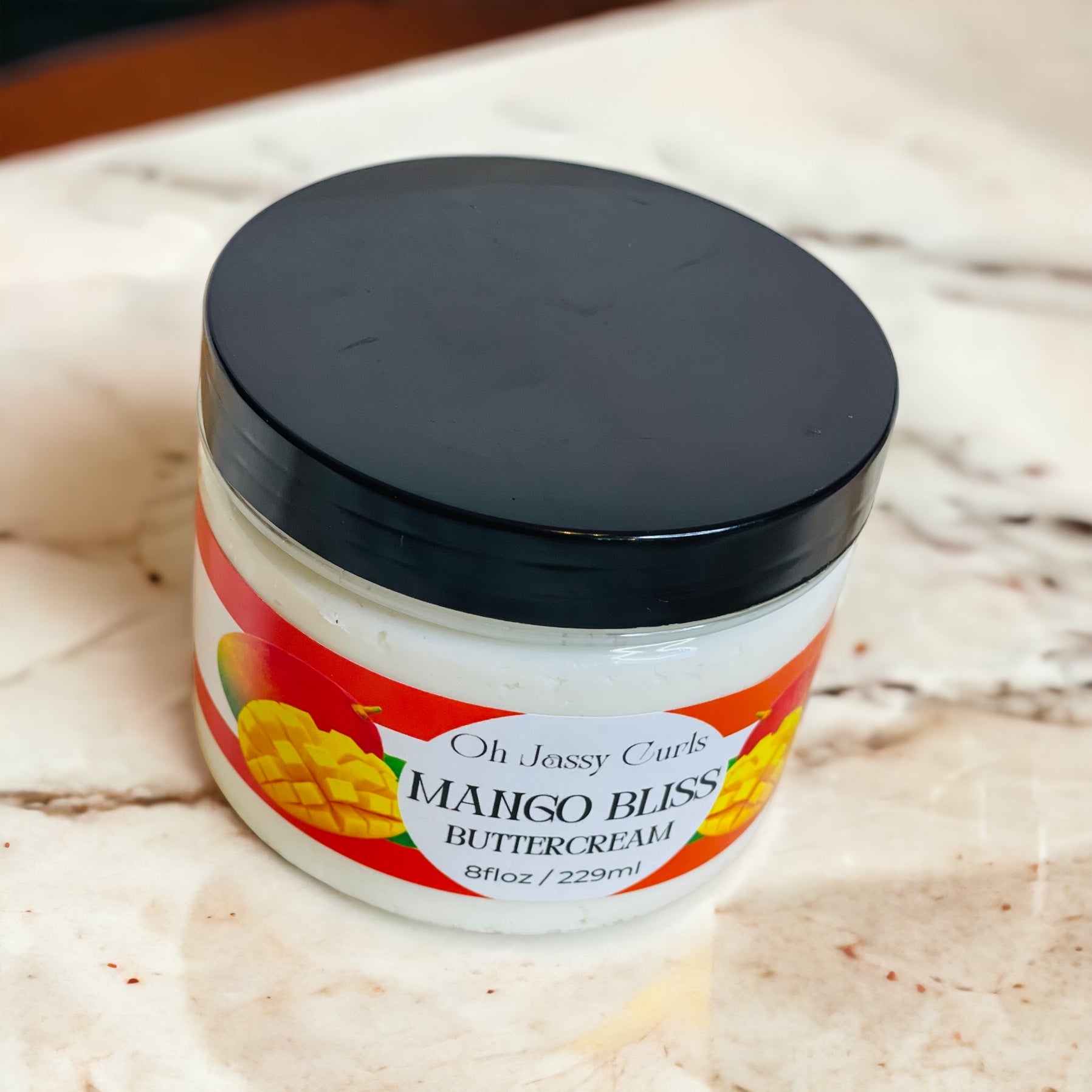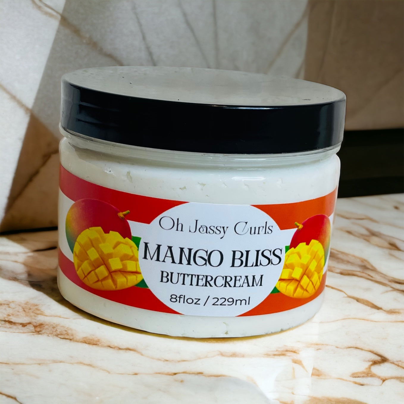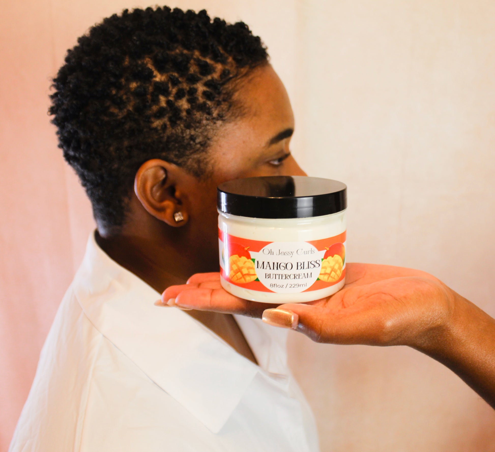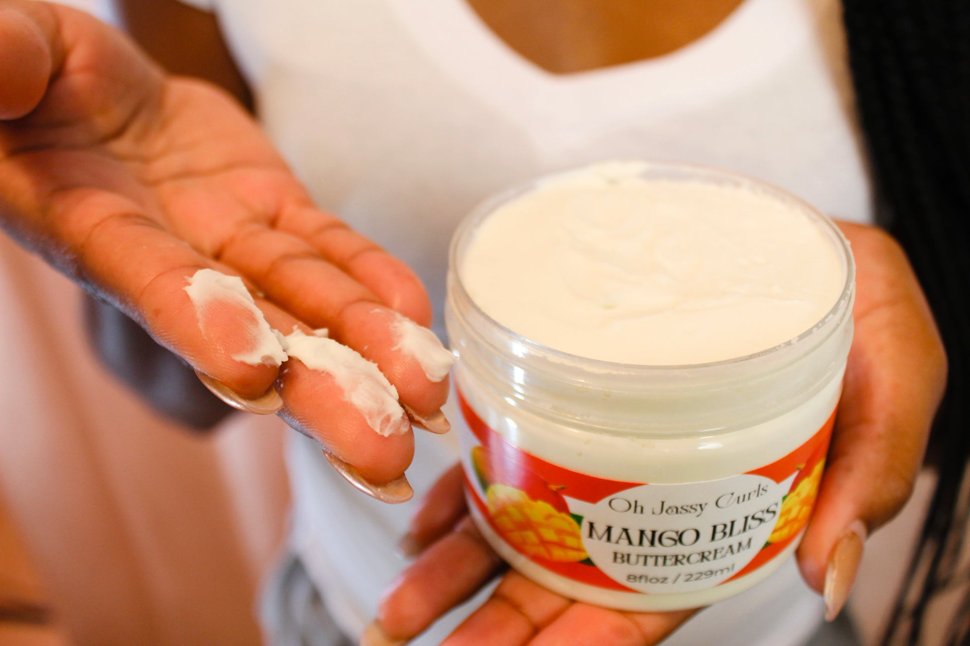 Scoop a generous amount (depending on hair thickness) of Mango Bliss Hair Buttercream in palm of hand and rub together. Apply to clean wet or dry hair. Great for twist outs and braids. Reapply 2-3 times a week.